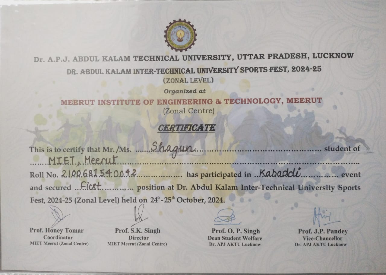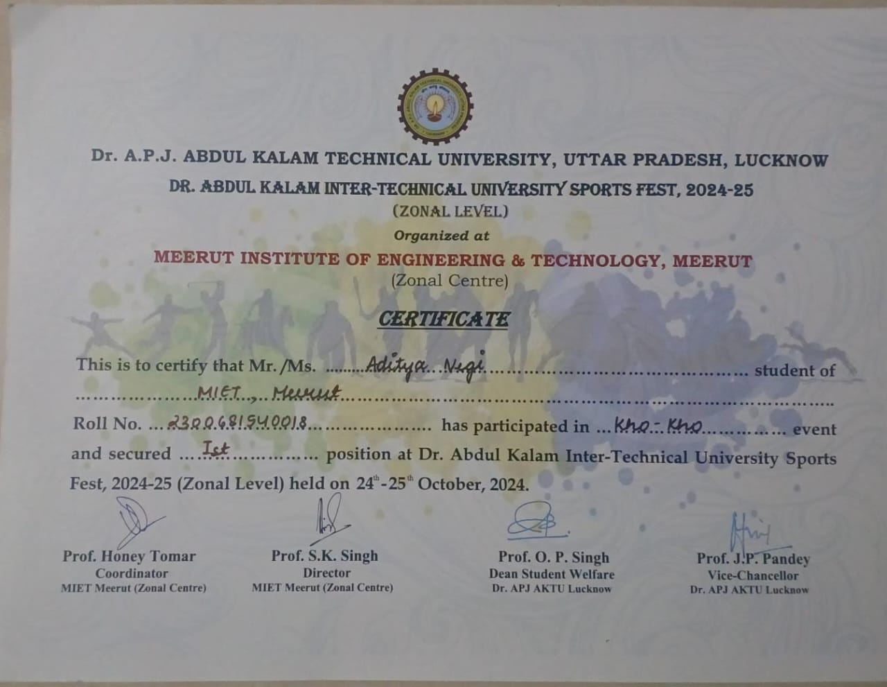 8 | 2024-25 | Aditya Negi | 24,25-10-2024 | 1st position in the AKTU Sports Fest, 2024-25 (Zonal Level) |