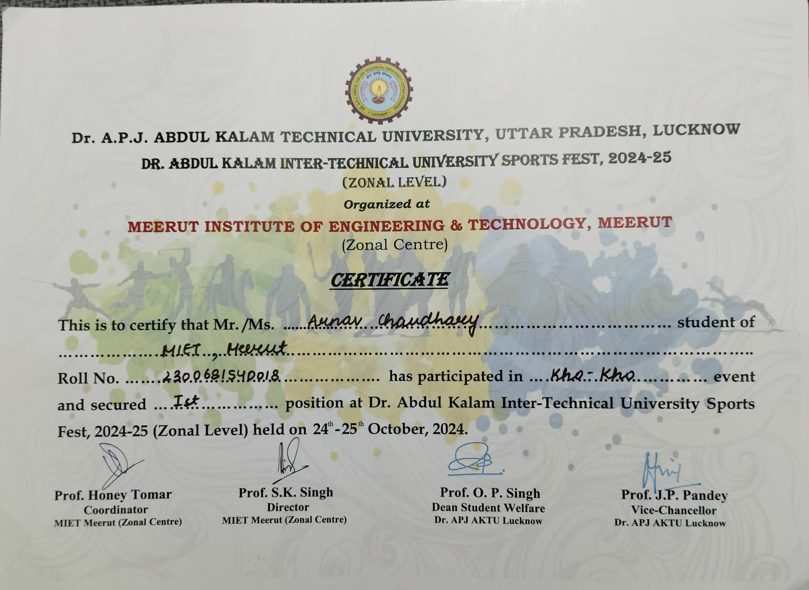 4 | 2024-25 | Arnav Chaudhary | 24,25-10-2024 | 1st position in the AKTU Sports Fest 2024–25 (Zonal Level). |