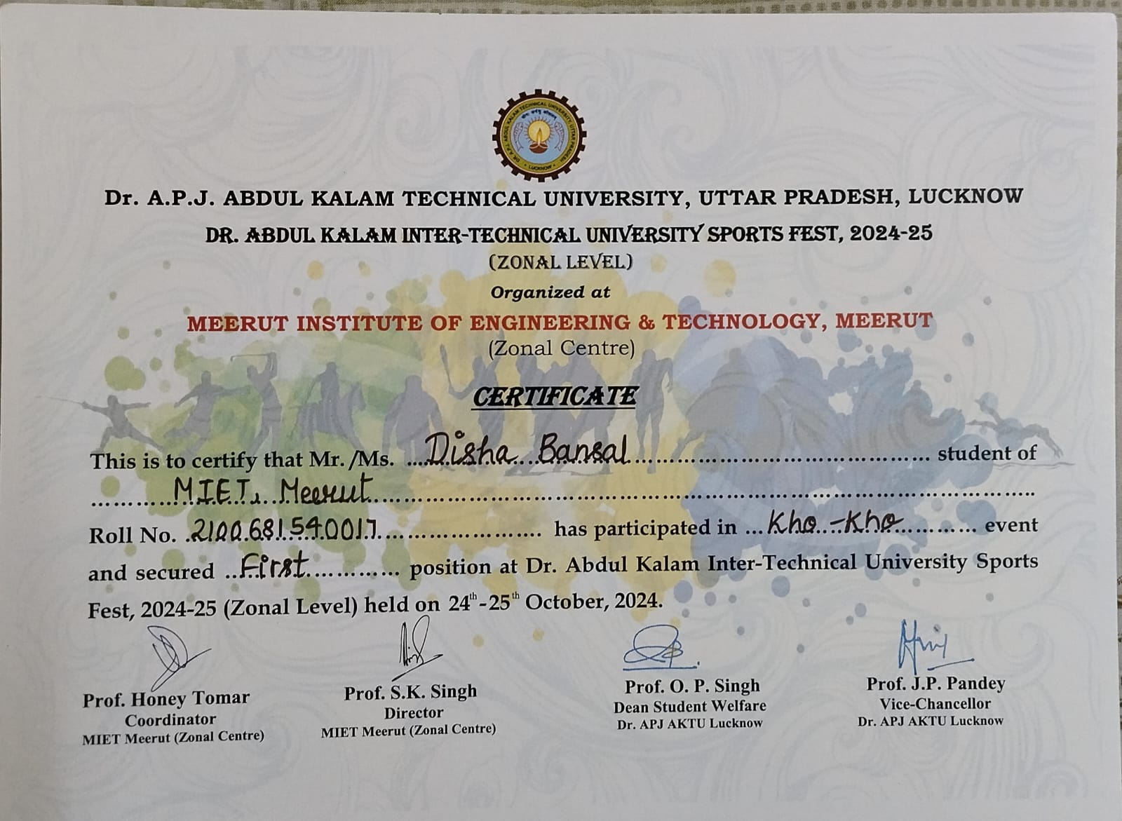 5 | 2024-25 | Disha Bansal | 24,25-10-2024 | 1st position in the AKTU Sports Fest 2024–25 (Zonal Level). |