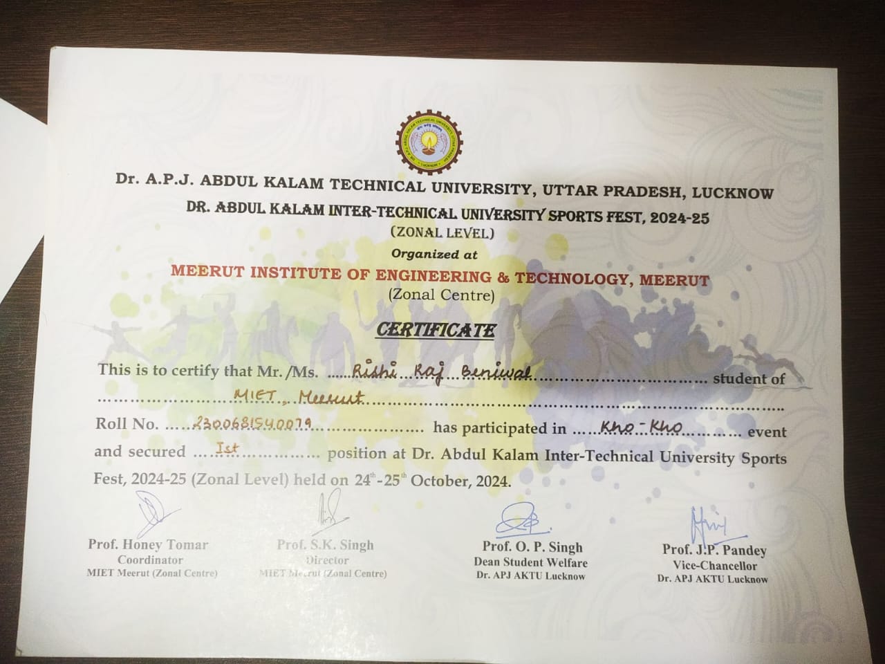 3 | 2024-25 | Rishi Raj Benival | 24,25-10-2024 | 1st position in the AKTU Sports Fest 2024–25 (Zonal Level). |