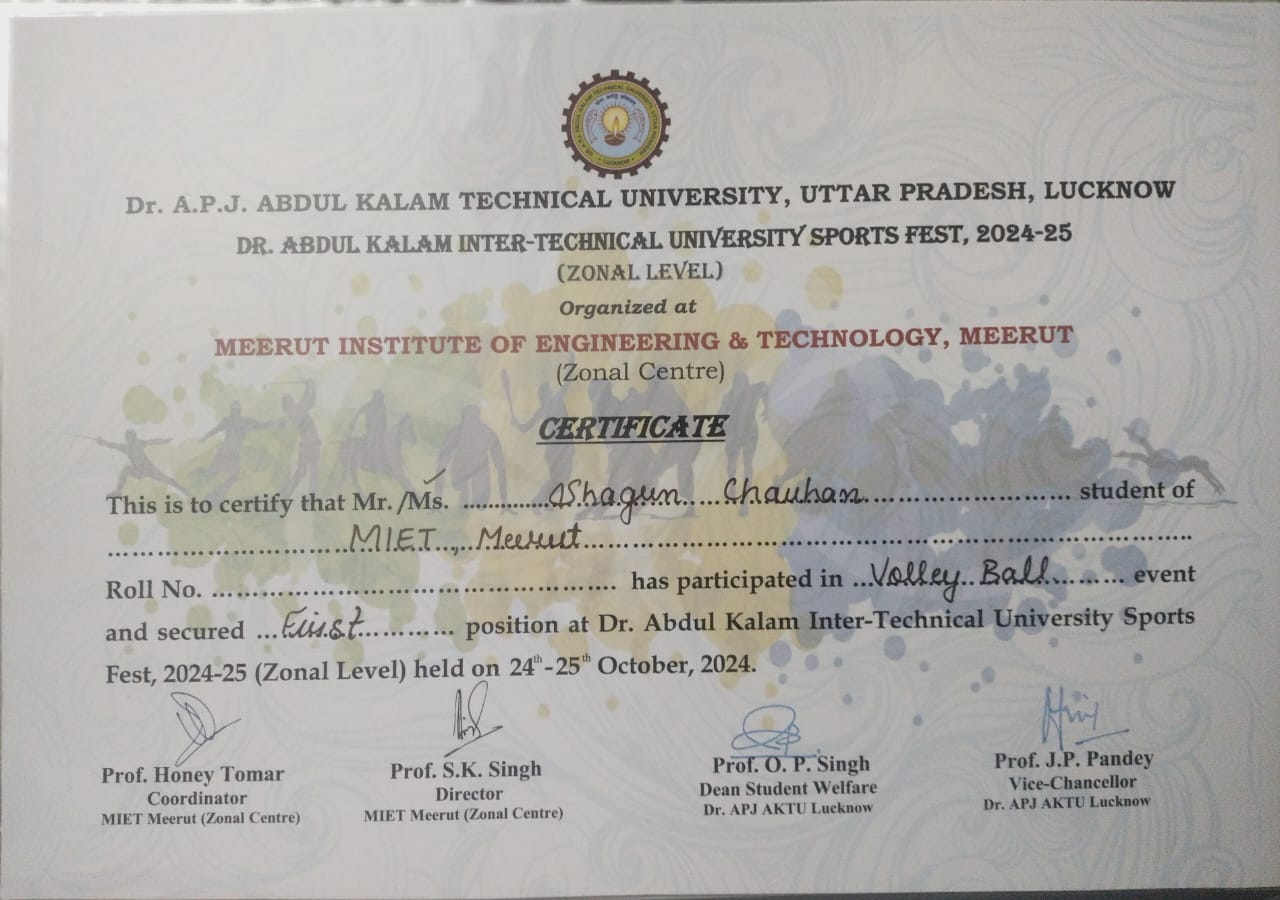 6 | 2024-25 | Sagun | 24,25-10-2024 | 1st position in the AKTU Sports Vollyball Fest 2024–25 (Zonal Level). |