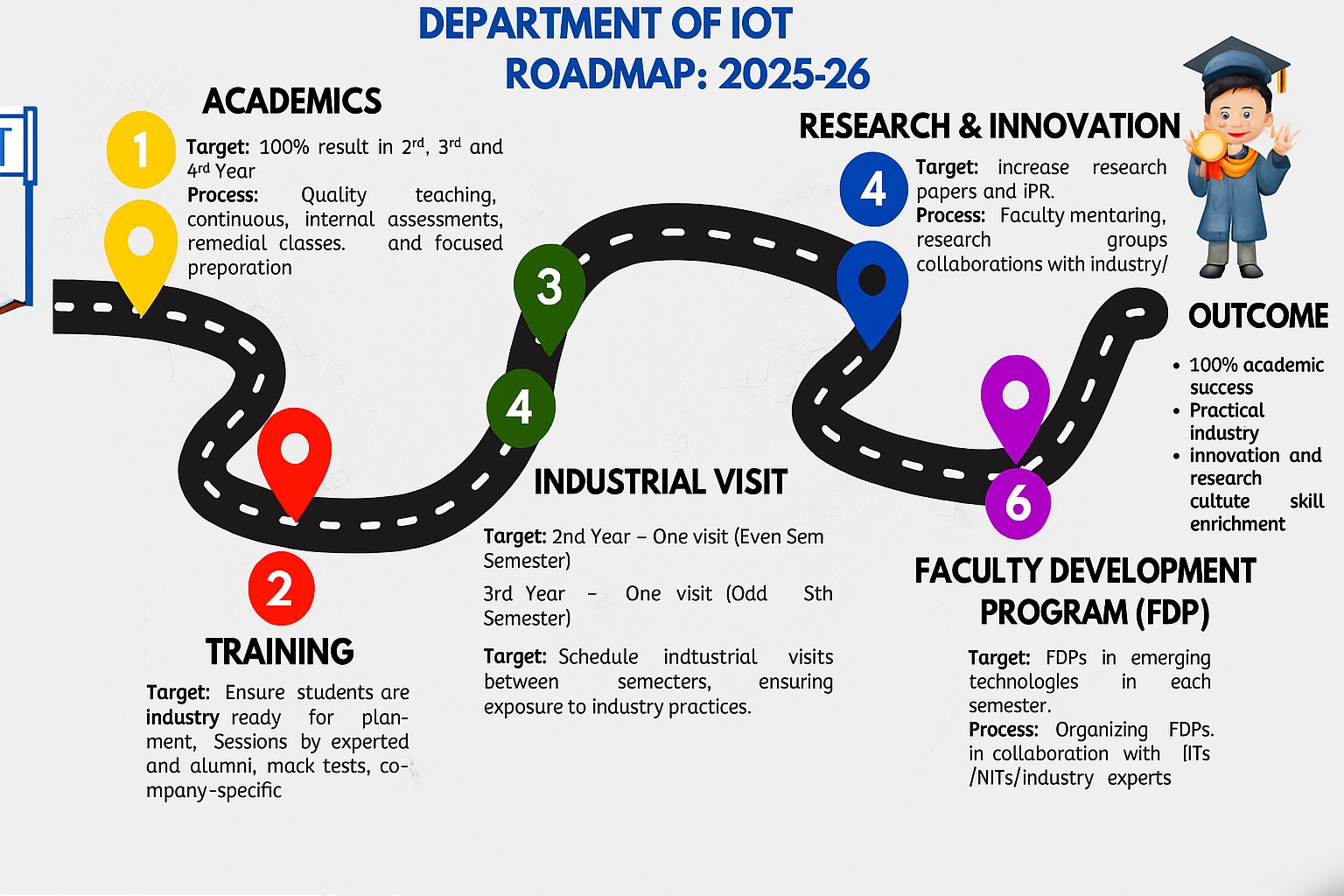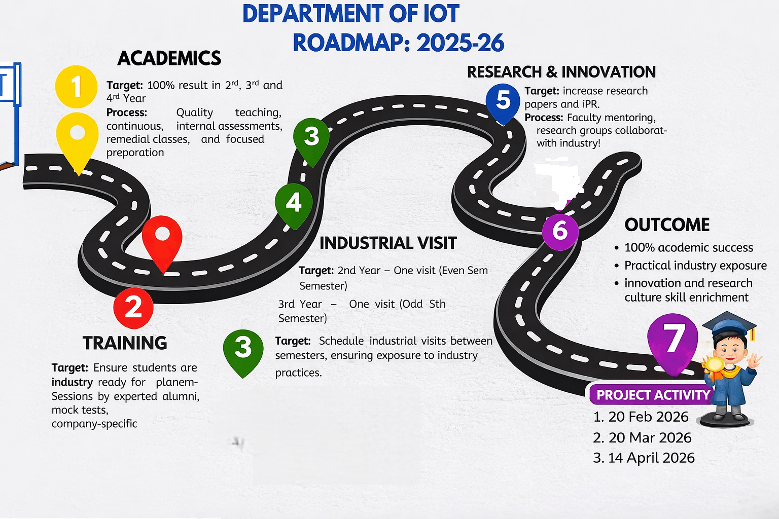 Our curriculum is thoughtfully designed to blend core computer science fundamentals with specialized knowledge in IoT, embedded systems, cloud computing, and smart technologies. We strive to nurture professionals who are not only technically skilled but also capable of driving innovation and solving real-world problems across diverse sectors. With the support of experienced faculty and well-equipped laboratories, our students engage in practical, hands-on learning through projects, industry internships, and collaborative research initiatives. We emphasize creativity, critical thinking, and a strong sense of ethical responsibility to ensure students are well-prepared for the challenges of the future.