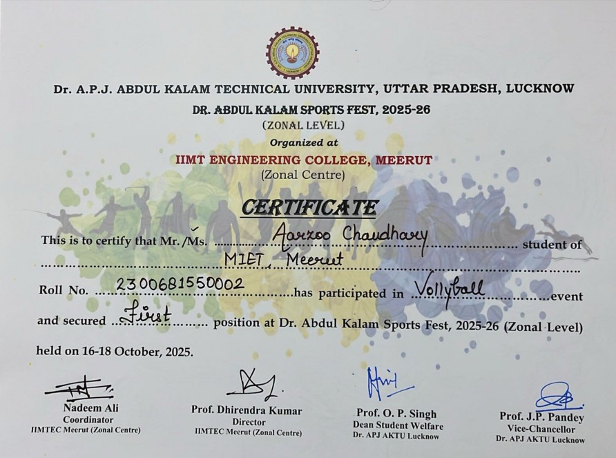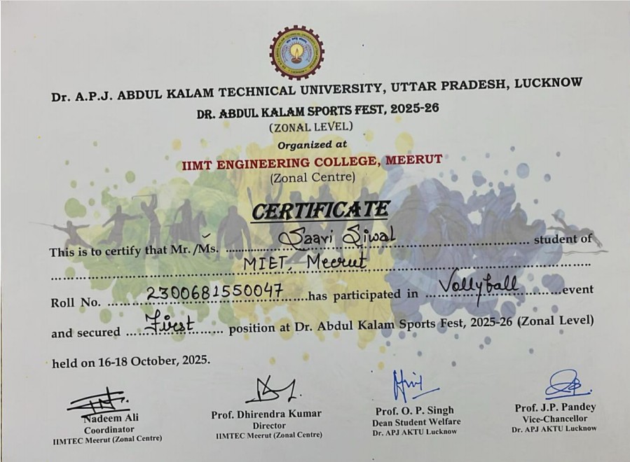 | 2 | 2025-26 | 18-10-2025 | AKTU Sports Zonal - Volleyball (Gold Medal) |