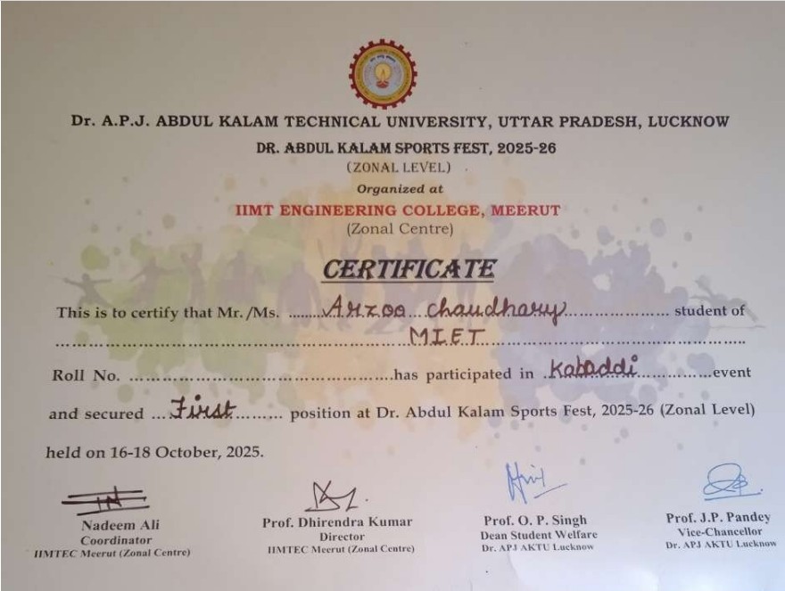 | 1 | 2025-26 | 7-11-2025 | AKTU Sports State Level - Kabaddi Girls (Gold Medal) |