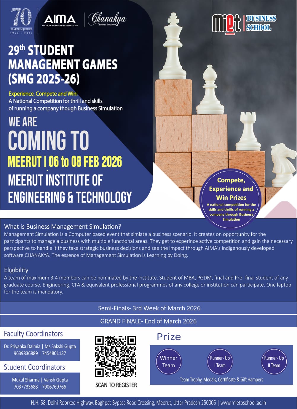 | 1 | 2025-26 | 06-2-2025 | AIMA 29th Student Management Games (Chanakya) | MIET Business School |
