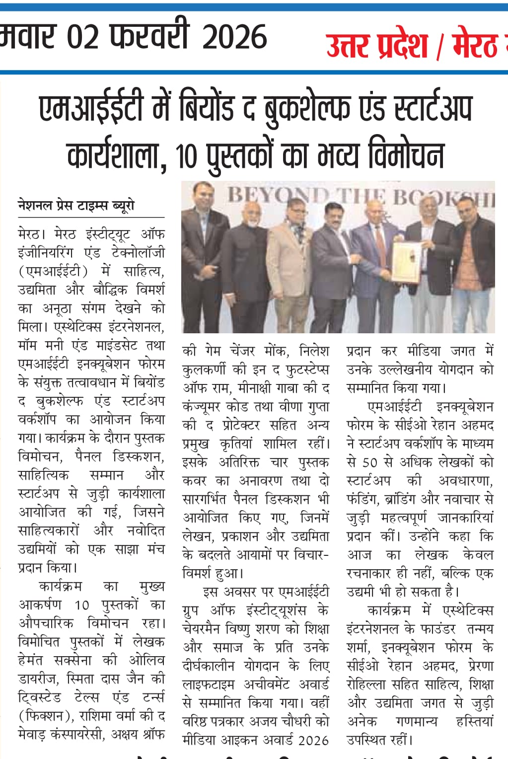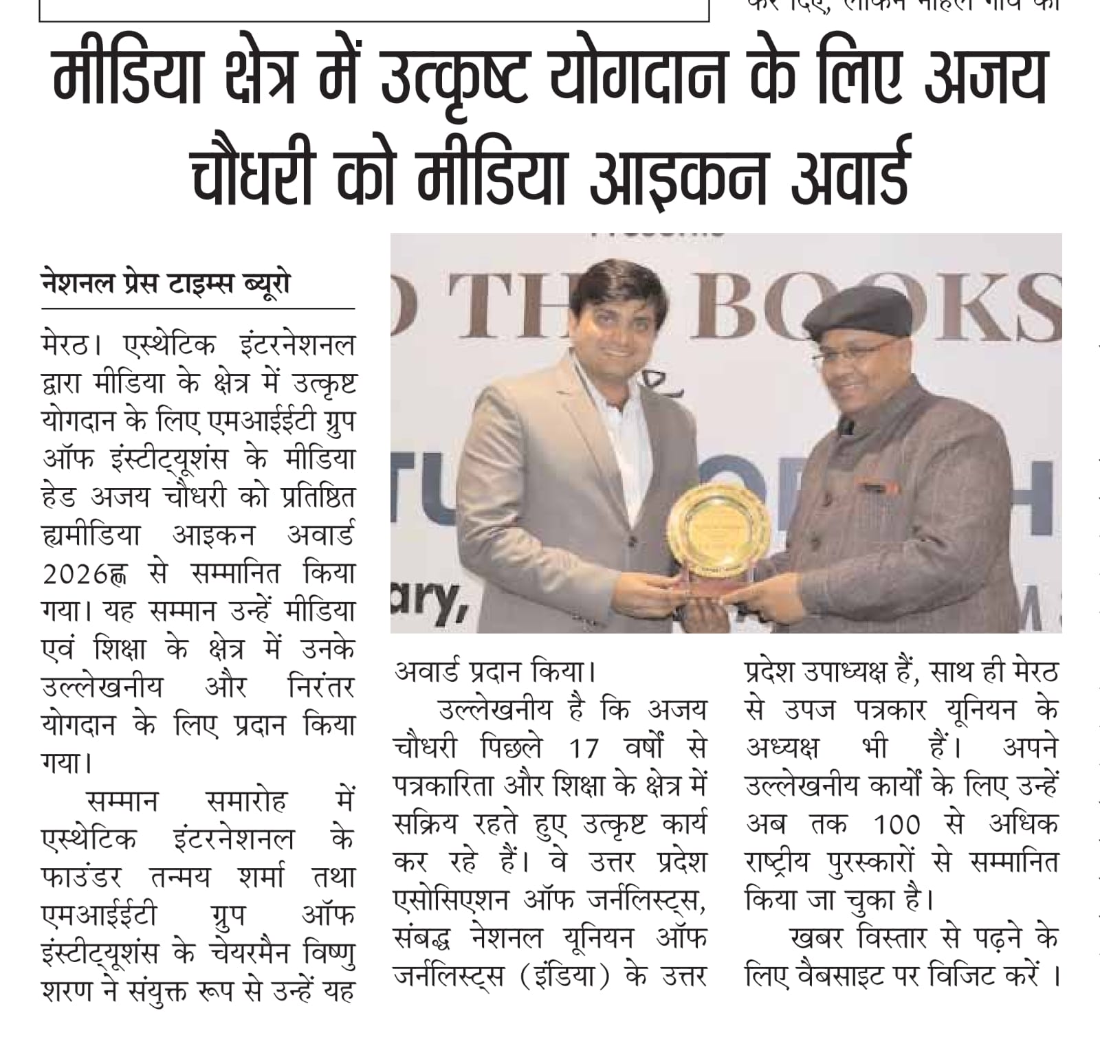 For outstanding contributions in the field of media, Mr. Ajay Chaudhary, Media Head of MIET Group of Institutions, was honored with the prestigious "Media Icon Award 2026" by Aesthetics International.